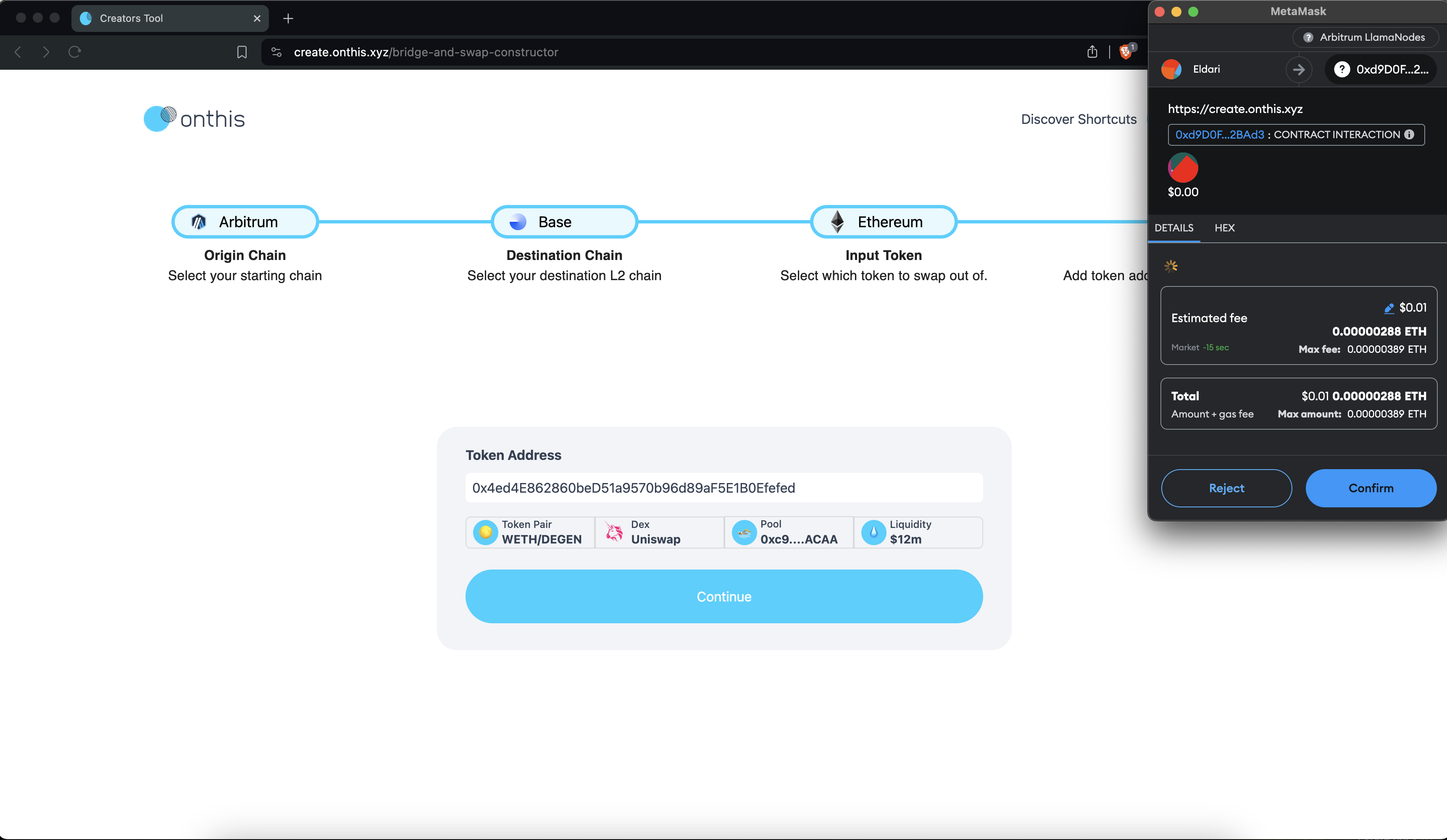4. Paste in contract address of the token you are swapping into & click "Continue" to approve the deployment on your wallet extension.\